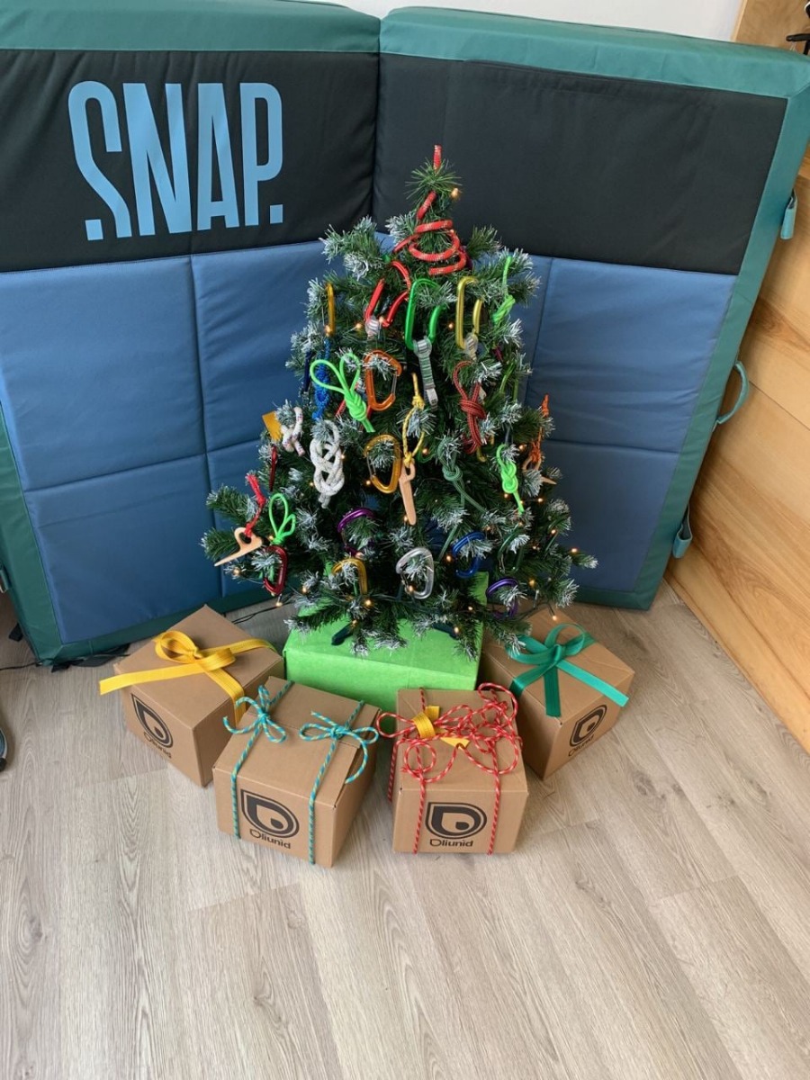 La période est propice, les maisons commencent à être décorées des lumières et guirlandes de Noël, et le grimpeur qui fait déjà partie de l'univers de l'escalade cherche un moyen de rendre son propre arbre de Noël plus original... voir "vertical". Place aux mousquetons plutôt qu'aux boules, mais aussi aux cordes et aux longes plutôt qu'aux guirlandes, et même à un chausson plutôt qu'à une étoile ! (Celui de la photo ci-dessous est l'authentique sapin de Noël de l'Oliunìd Shop !) Tout ceci sans parler des paquets que tu trouveras sous le sapin, sûrement tous rigoureusement choisis sur un thème particulier... que du bonheur!