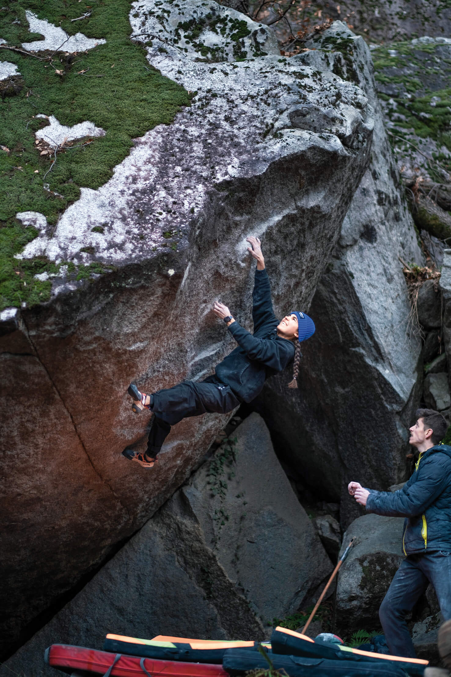 Brooke Raboutou sur La Proue 8b, secteur La Boule. Photo de Finn Stack