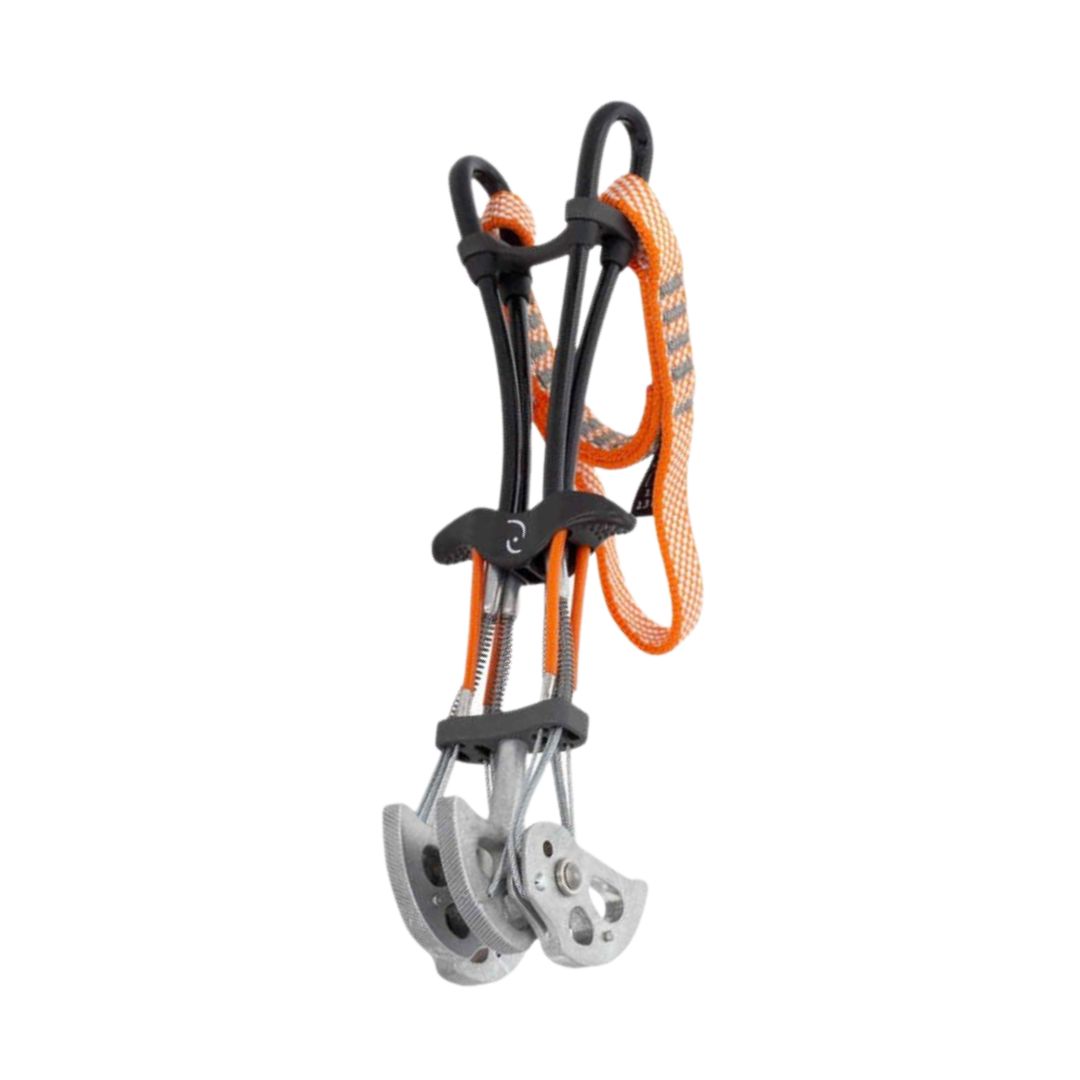 Double. Souvent de taille plus grande que ceux à tige unique, ils ont donc également des dimensions encombrantes lorsqu'ils sont attachés au baudrier. En contrepartie, ils sont capables de mieux dissiper l'énergie cinétique de la chute en la déchargeant sur les deux axes de rotation des cames. Leur véritable point fort réside cependant dans leur résistance accrue aux abrasions contre la roche, garantissant ainsi une plus grande durabilité dans le temps.