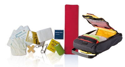 À l'intérieur, tu peux trouver des gants, des pansements, des ciseaux et tout ce dont tu peux avoir besoin pour soigner une blessure. Tu trouves aussi une attelle en aluminium pour les fractures.