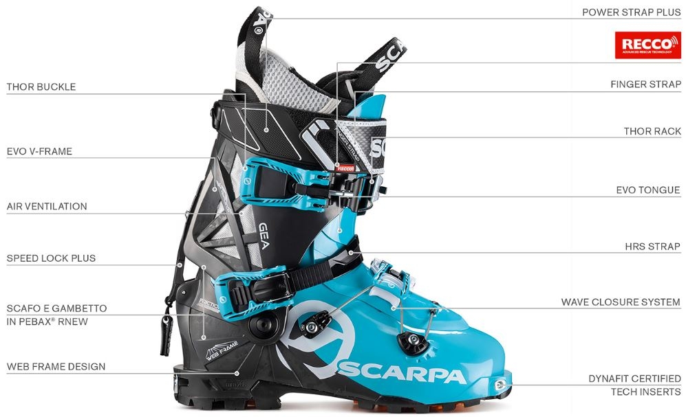 SCARPA Gea est une chaussure de ski alpinisme pour femme extrêmement polyvalente, compatible avec toutes les fixations de ski alpin et idéale pour des skis d'une largeur comprise entre 75 et 95 mm.